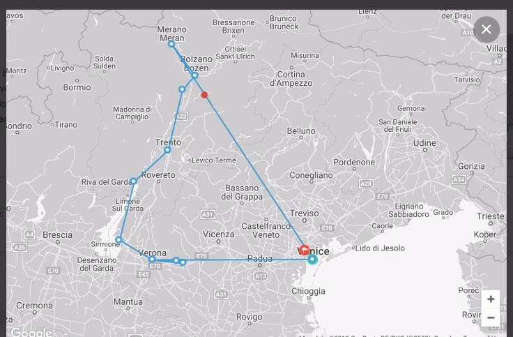 In late September I will be leaving to travel to Milano for 2 nights and then joining a bike tour that begins in Trento. A short train ride from Trento brings us to the starting point in Bolzano with views to the Dolomites and a bike path that follows the Adige River back to Trento. This is a protected path with great river views and mostly flat.