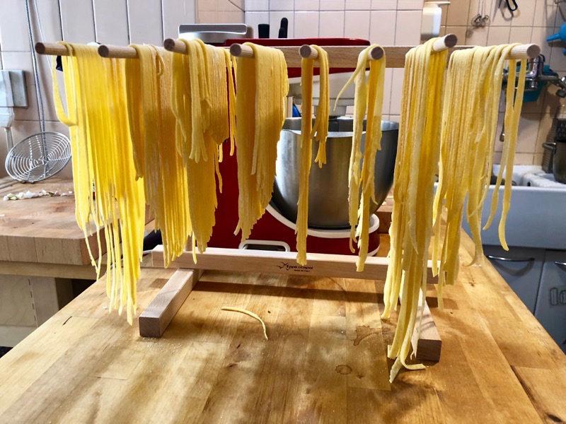 This is an easy relaxed time with everyone taking part in the pasta making. Golden rule is 100 grams of flour and 1 egg. You want a dry dough, not sticky. When the dough is throughly mixed, wrap in plastic wrap and refrigerate for 1/2 hour.