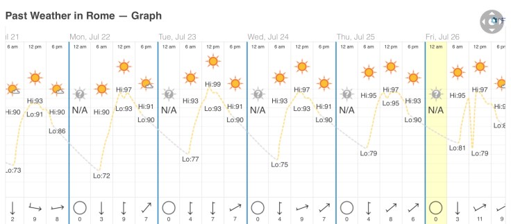 The top photo shows Rome hovering near 100 degrees for the week.