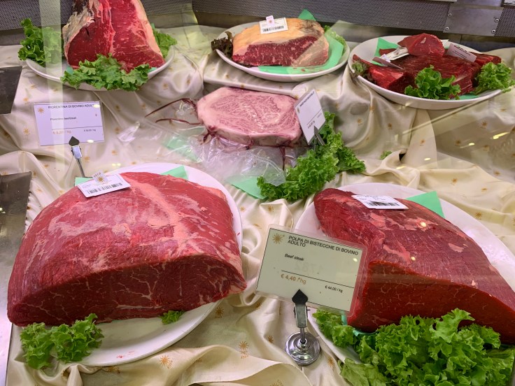 My wife purchased about 8 oz of pecorino cheese, and a small container of frutti di mare and the total was 35 Euros. But this is a special place. Prosciutto is on a cutting board and is cut to order. Nothing that is not fresh is sold here.
